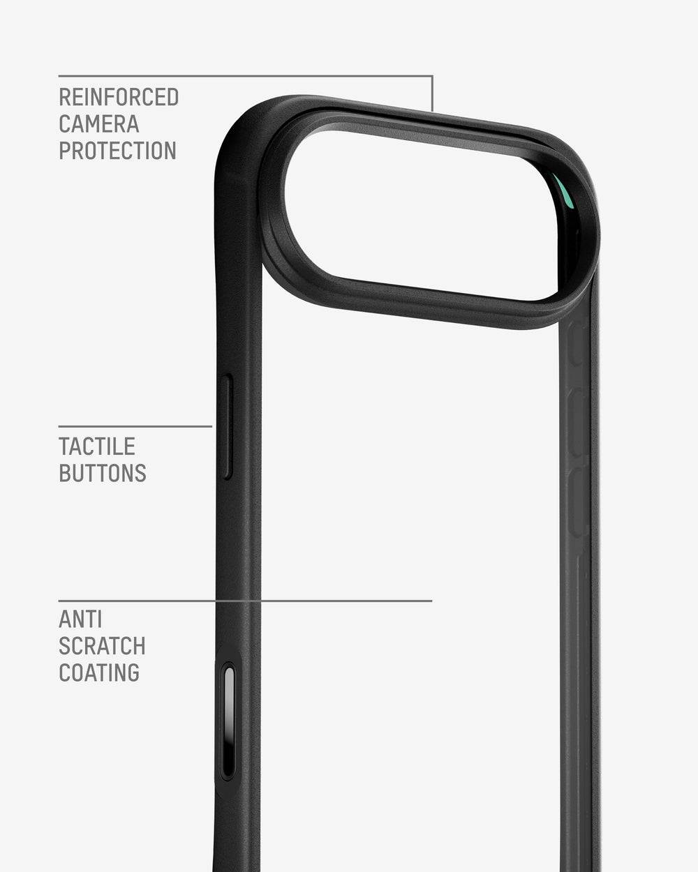 Clarity is our most protective clear case. Corner-focused AiroShock® cushions key impact zones while a rigid PCTG co-polyester body resists flex and torsion. A reinforced camera ring made from glass-filled polycarbonate and strategically raised edges add extra defence for your lenses and screen.