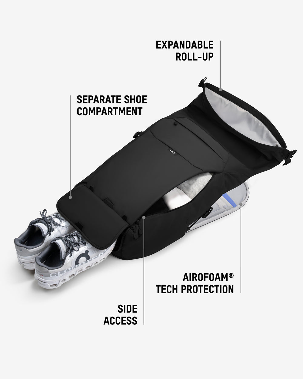 • Zonal compartments keep work and gym gear separate, including a ventilated shoe section.