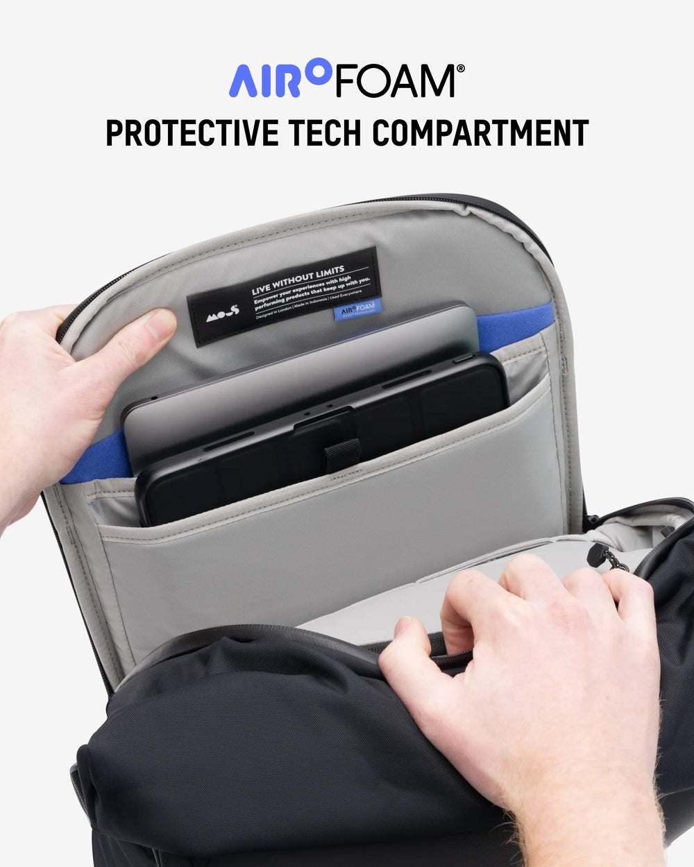 • Protective tech compartment with AiroFoam® absorbs shock from drops.