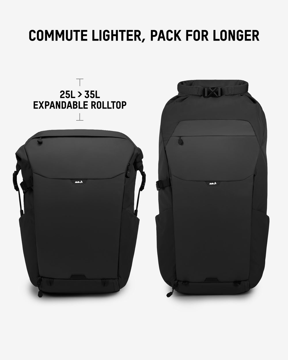 • Roll top expands from 25L to 35L to flex with your routine.