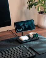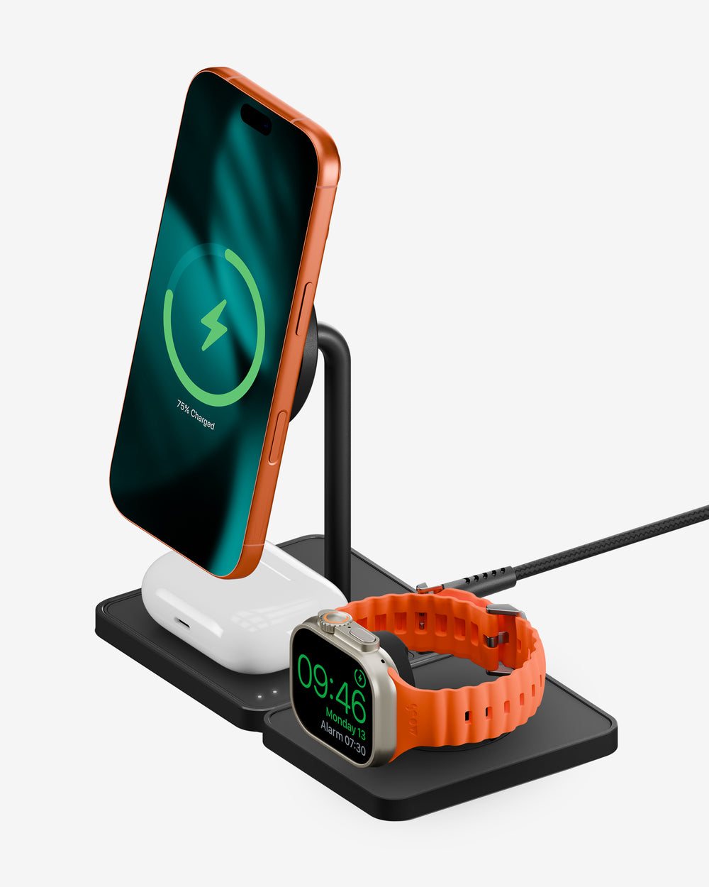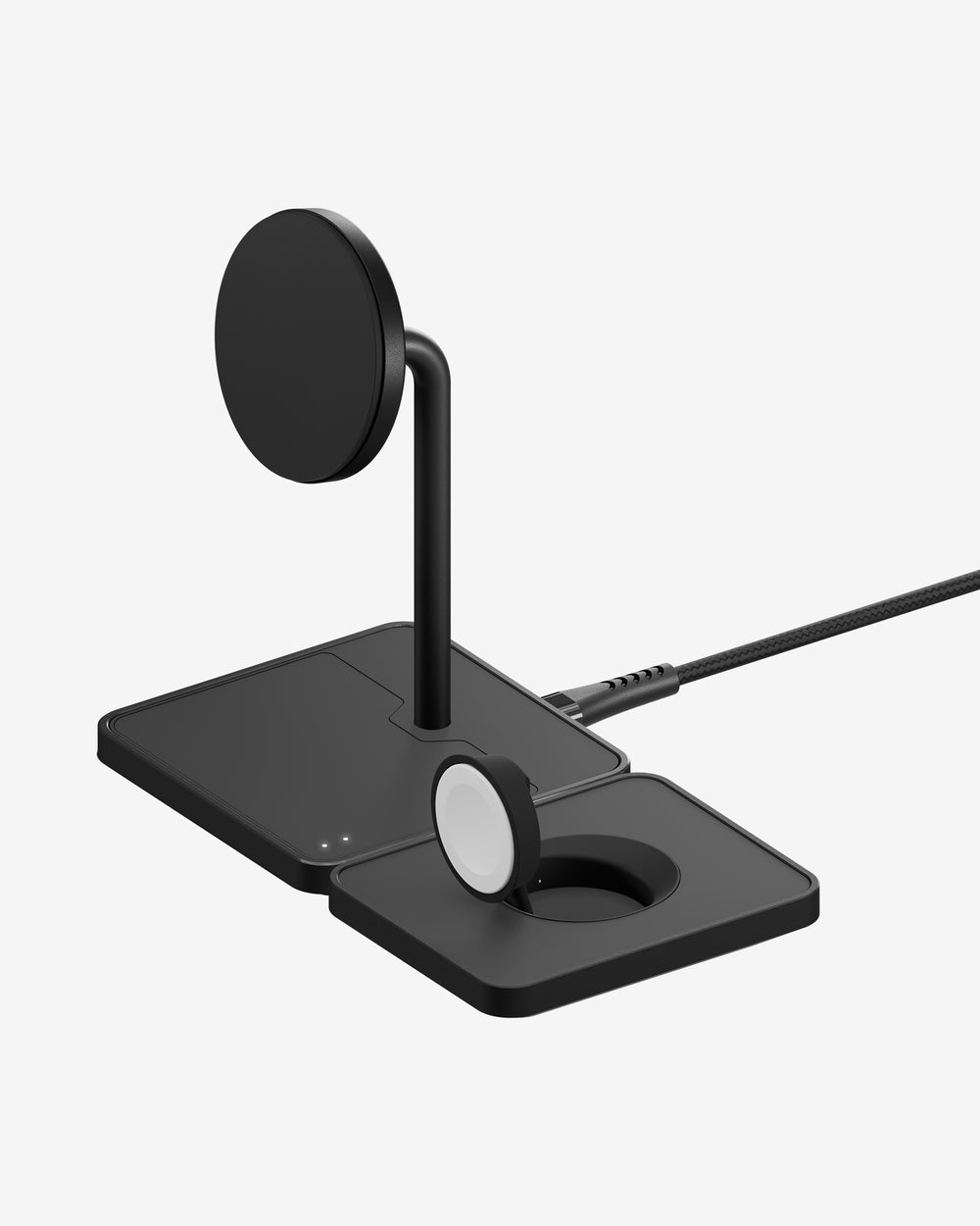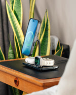 A refined wireless charging setup for iPhone and Apple Watch. Designed to power your everyday with ease at home or on the go.