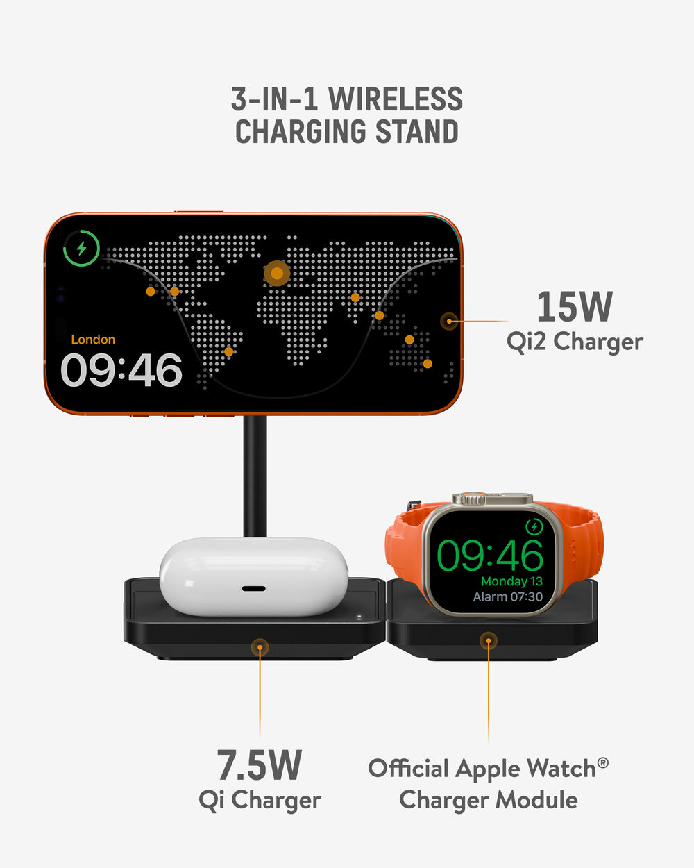 • Delivers up to 15W fast wireless charging for Qi2 and MagSafe® compatible phones and up to 33% faster charging for Apple Watch Series 7 and later.