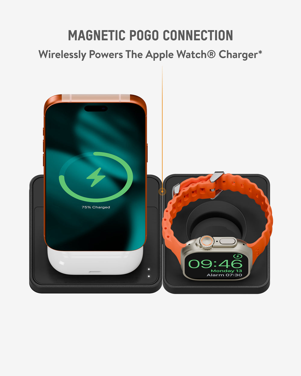Yes. The Apple Watch Charger magnetically connects to the stand’s pogo pins, creating a secure modular link that transfers power directly through magnetic contact. This allows both chargers to draw power from a single cable while the base Qi coil powers a third device such as earbuds.