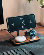 Yes. The Pixel Watch Charger magnetically connects to the stand’s pogo pins, creating a secure modular link that transfers power directly through magnetic contact. This allows both chargers to draw power from a single cable while the base Qi coil powers a third device such as earbuds.